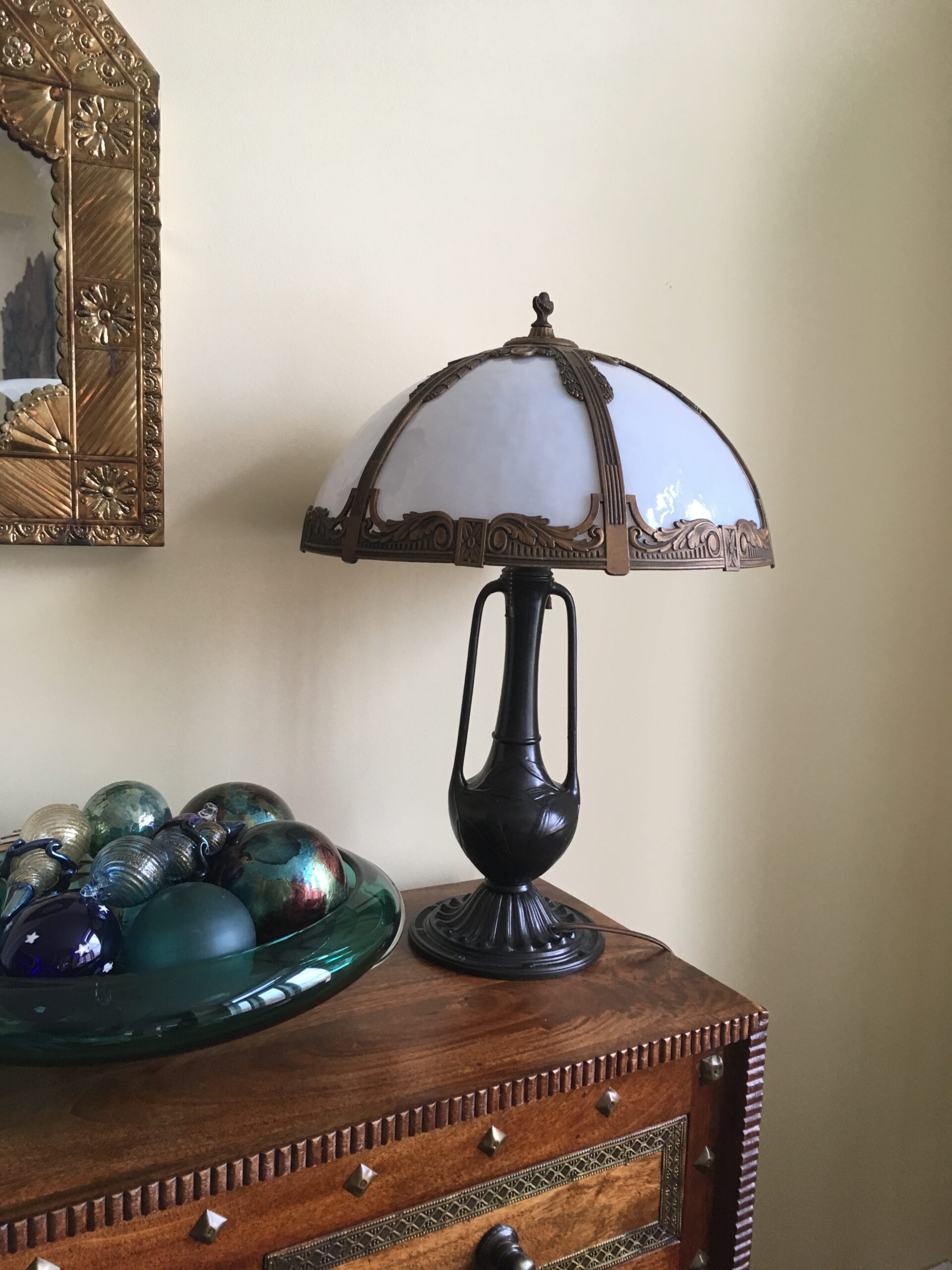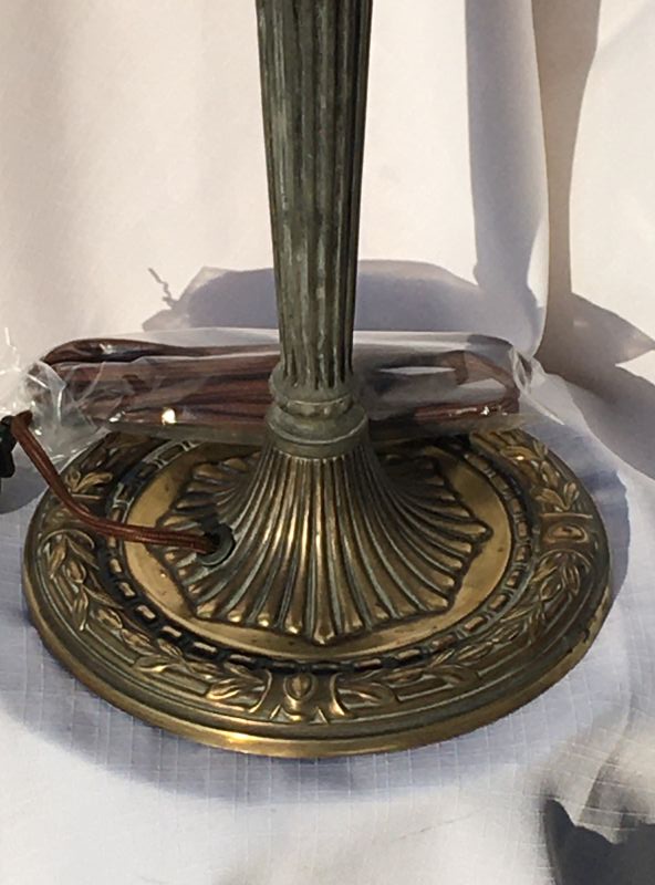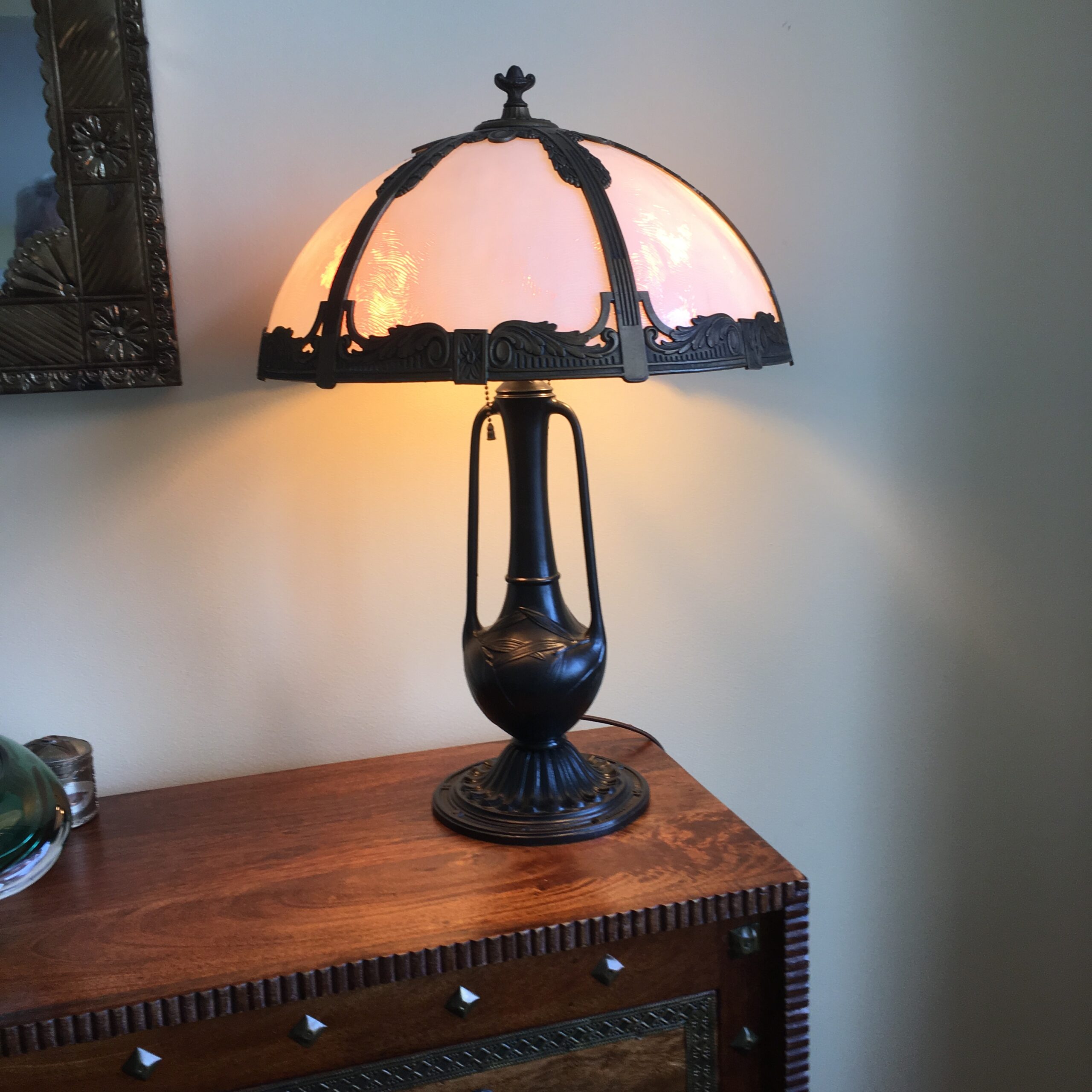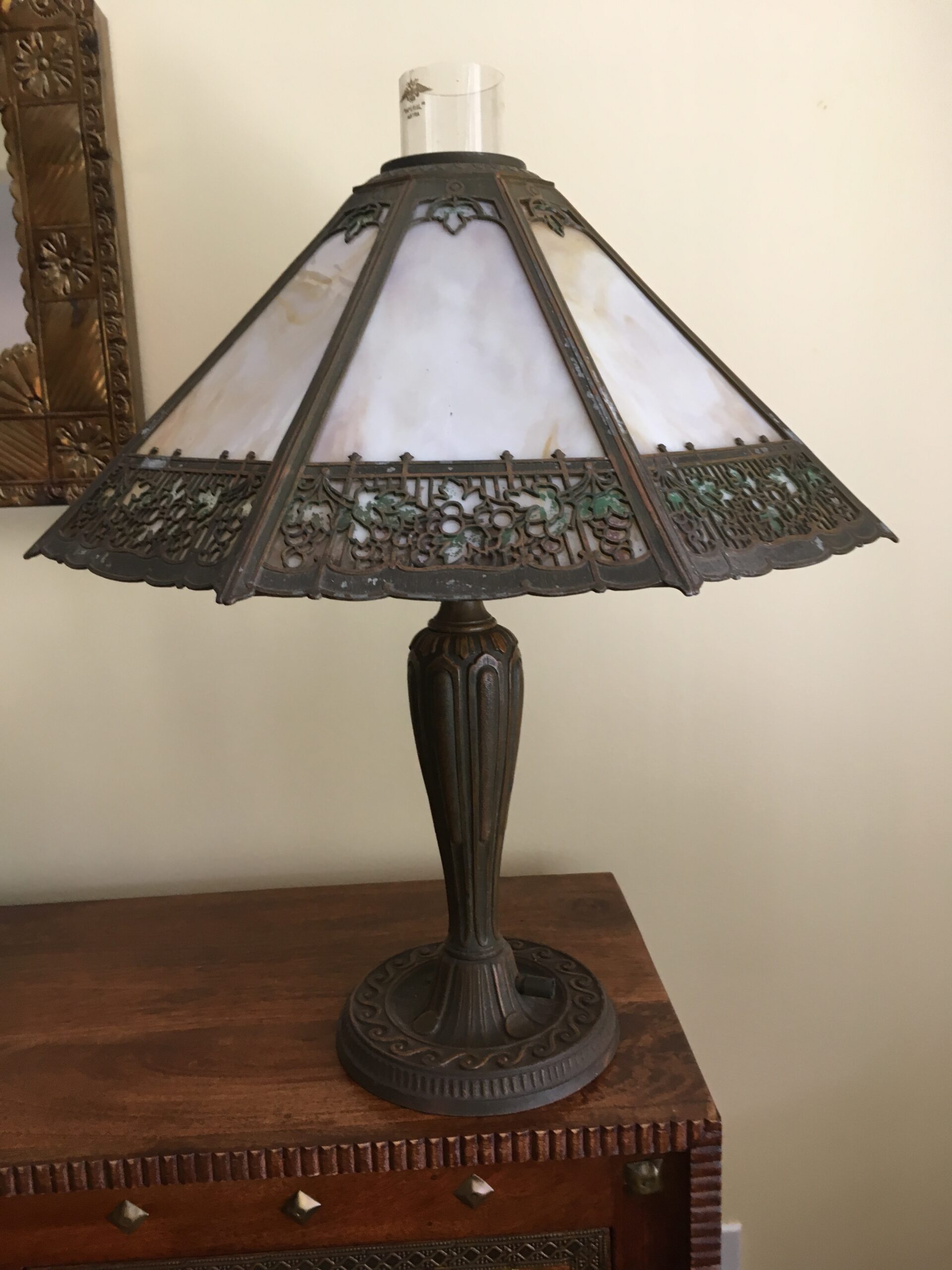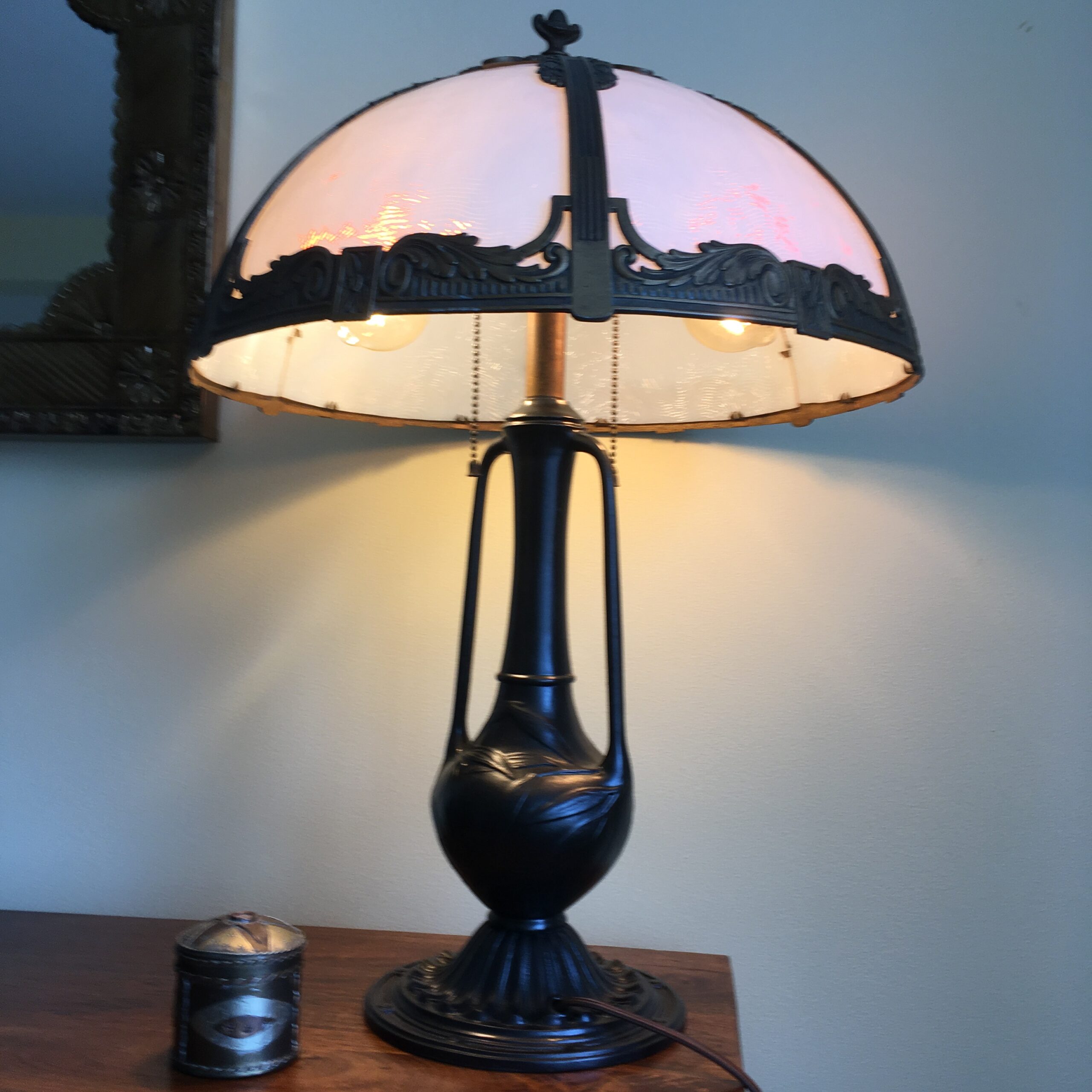 .Below are just a few of my antique slag glass lamps that are in stock and for sale. Over the past 45 years I have often been asked to re purpose a slag glass lamp that has served a family for many years. There is no one reason or a simple reason why these antique lamps have been left in my care. Other than to say they are donated with heavy hearts and memories. This collection of slag glass lamps reflects an understanding with the original owners. That I find a new family that is willing to cherish their 100+ year old slag glass lamps. Some of the lamps in my collection have been completely restored and some left as I received them. Many of the slag glass lamps for sale were made by Bradley and Hubbard, E Miller, Salem Brothers, Chicago Mosaic, Rainaud or Moe Bridges. These are just some of the popular period manufacturers between 1900-1945. Many are unmarked but all are genuine original 1900-1945 period unless noted. All antique slag glass lamps for sale are available if posted. If your serious about a lamp I can best help you if you call me. Emails can be confusing and provoke even more questions and work. I would love to help you so please call me Len at 401-314-6005 (12-6ESTime).