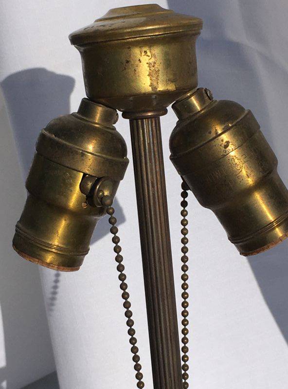 The slag glass panels all matching KOG #11GCPL caramel and white. This is a very rare discontinued color texture which was popular 100 years ago. Their description states “theban and gold frame”. The base has a complementing brown painted finish (minor chipping from age and use). The top of the base has a re wired Bryant three bulb cluster with original pull chains in good working condition. A 10′ rayon reproduction brown braided cord set was installed with a polarized plug. Bulbs are not included. Questions please call.